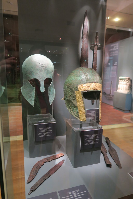 Греки любили воевать,но их целью было не пролить кровь,а завоевание новых территорий и увеличение своей власти. Глупо было бы истреблять народ,ведь на завоеванных землях кто-то должен работать) Поэтому отдельная часть выставки посвящена обмурдированию и оружию тех времен.