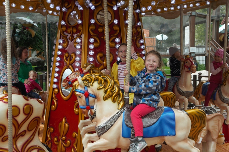 Ограничение по возрасту - 12 лет, это для "посидеть на лошадке". Но мам пускают тоже, конечно, для подстраховки очень маленьких детей. Я страховать никого не пошла, я безответственная мать мои уже большие. Каруселька работает весь день с перерывом на обед с 13 до 15 часов.