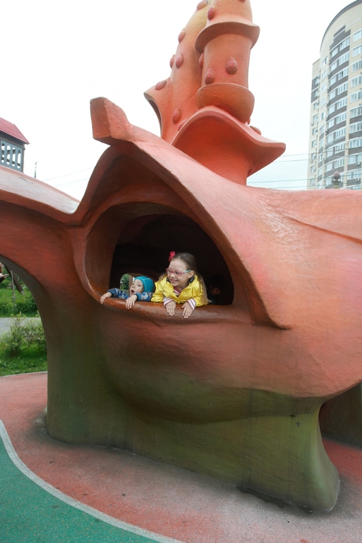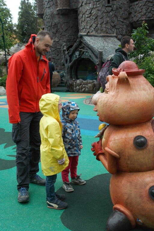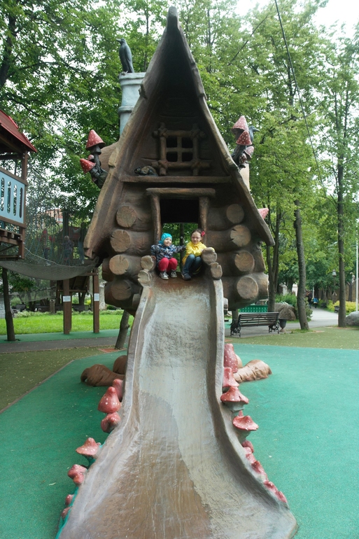 А взрослым просто приятно глазу видеть всю эту сказку вокруг. В замок можно и нужно залезть. Там есть трон, можно выйти на балкончики, вниз можно спустится по горкам, а можно уйти в небо по веревочному городку.