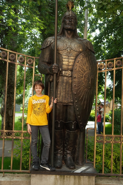 А потом, уже уходя, мы сделали на память снимок с "витязем прекрасным". Очень они мне понравились, стоят по периметру парка с внешней стороны забора, соседствуя местами с такими же "бронзовыми" дядюшками Ау.