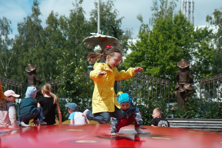 А если дети слишком разгорячились, прыгая на батуте, их можно переманить на карусельку.