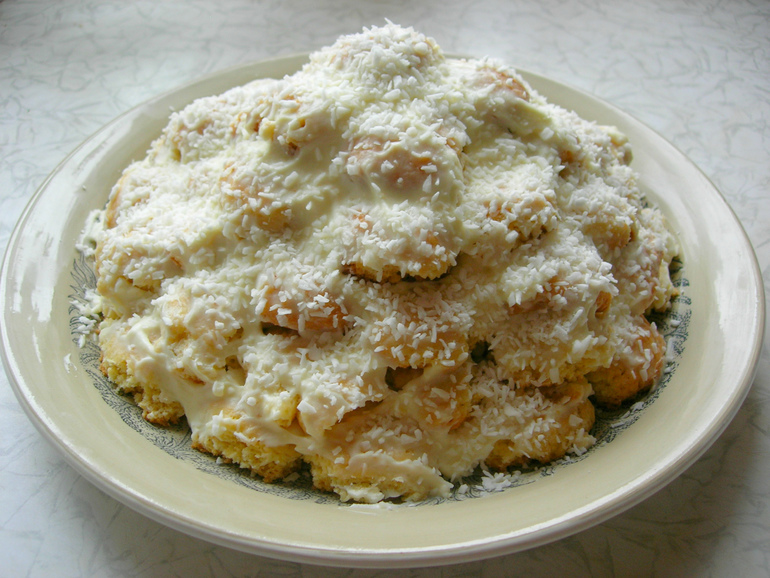 4. Испеченный бисквит, сразу же горячий, переложить на другой лист пергамента. Аккуратно отделить от коржа пергамент, на котором он выпекался. Свернуть корж в рулет. Оставить его в таком положении до полного остывания.