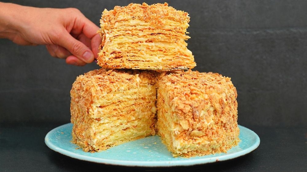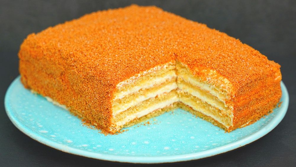 3. Противень выстелить пергаментом. Вылить тесто и равномерно его распределить. Выпекать бисквит в заранее прогретой до 180 духовке 12-14 минут. Ориентируйтесь по своей духовке, корж тонкий, поэтому он выпекается быстро.