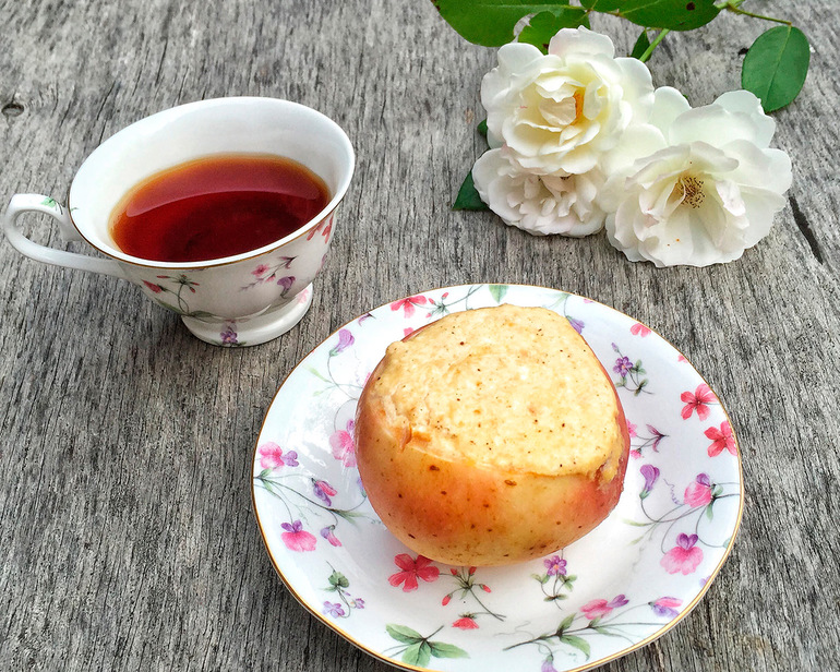 Срежьте верхнюю треть яблок. Вырежьте черенок и сердцевину. Аккуратно ложкой выскоблите немного мякоти. Смешайте все ингредиенты, и до верху наполните полученной смесью яблоки. Поставьте в противень/форму для выпечки, влейте немного воды и запекайте 25 минут при температуре 180 градусов.