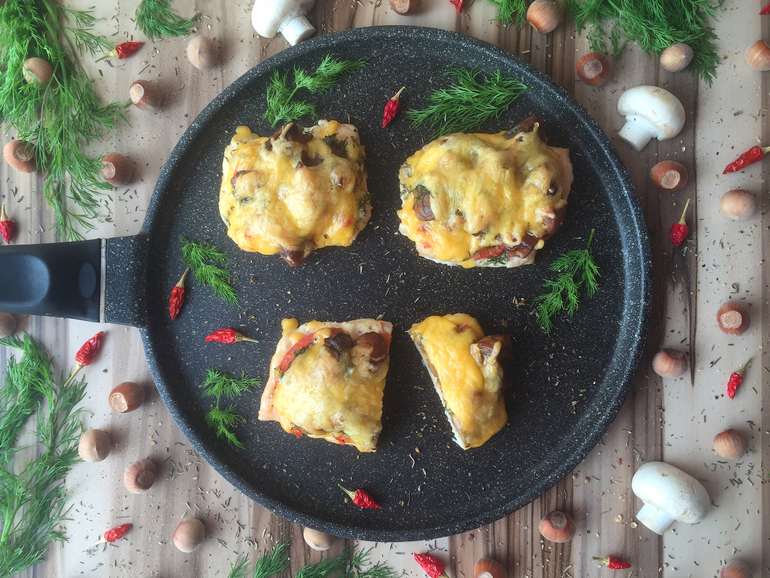 Овощи помыть и нарезать. Помидоры - дольками. Филе нарезать небольшими кусочками толщиной в 1 см. Отбить с 2-х сторон. Натереть сыр. Лук обжарить на сковородке. Добавить грибы и жарить до готовности. Добавить специи и перемешать. Форму смазать оливковым маслом. Положить мясо. Положить на мясо помидоры. Посолить и поперчить. Положить грибы, зелень и сыр. Выпекать в духовке 40 мин при 200°C. Приятного аппетита))