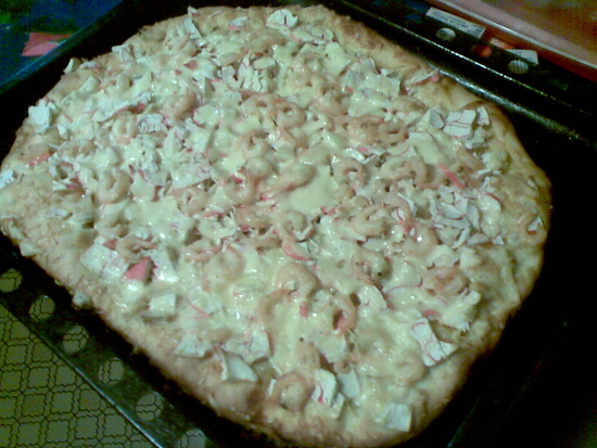 это с морепродуктами-креветки,палтус и крабовые палоски!Ну и конечно же супер-соус и сыр сверху!