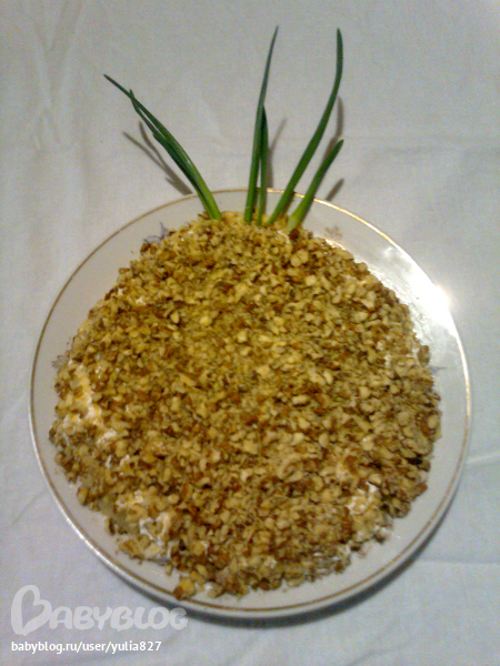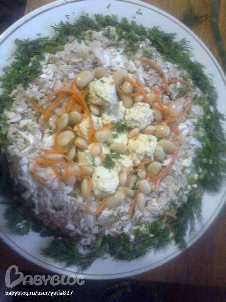 На блюдо выкладываем смесь картошки, мяса и белков. Посередине вылажить фасоль, на нее шарики из желтков. Края блюда обильно украсить зеленью в виде гнезда. Подавать лучше теплым, так вкуснее.