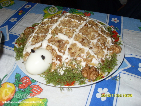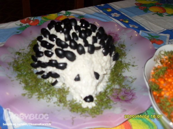 Это на годик сыну готовила - кролик тушенный, овощная запеканка, салаты Крабовая нежность, Ромашка, Пенек, Мясной с луком