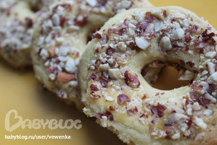 Достать тесто, раскатать пласт толщиной около 1 см. (добавлять муку, чтобы тесто было пластичным) вырезать колечки (вырезала банкой). У меня получилось 15 шт. Разложить колечки на бумагу для запекания и на противень.