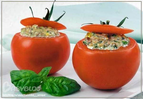 В конце жарки добавить мелко порезанные шампиньоны и потушить 10 минут. Яйца мелко порубить, соединить с тушеными луком и грибами, нарезанной зеленью, майонезом, солью и пряностям, хорошо перемешать и нафаршировать получившейся смесью помидоры.