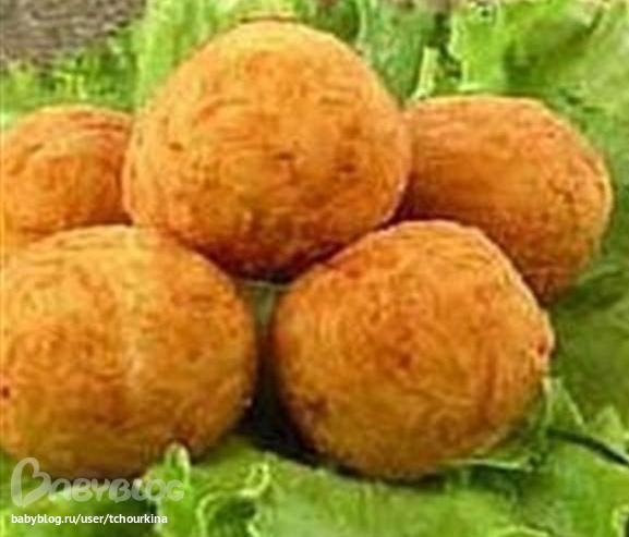 Обжарить нарезанный полукольцами лук, добавить размоченные пряности, жарить еще 1минуту. Добавить в эту сковороду размятую рыбу и жарить еще 2 минуты. В миске смешать картофельное пюре с зеленью. Добавить туда смесь со сковороды,перемешать и остудить. Сформировать шарики, разложить их на блюде с подложкой из листьев салата. Можно разложить на блюде кружки помидора и выкладывать шарики на них.