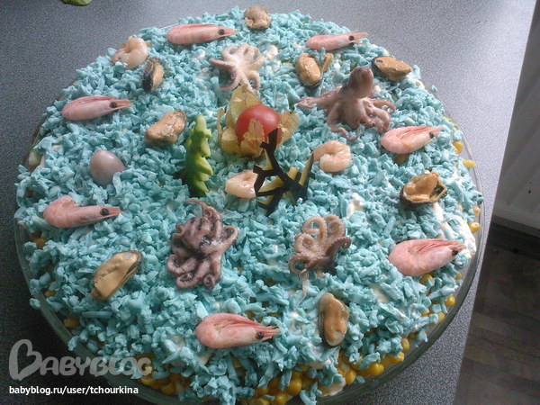Укладываем слоями, перемазывая майонезом: рис, красная рыба отварная, свежий огурец, кукуруза. Сверху засыпаем натертыми белками, которые предварительно вымачиваем в соке краснокочанной капусты (они становятся голубыми). свеху украсить морепродуктами, оливкам.