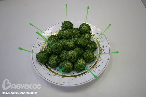 Красную часть крабовых палочек натереть на мелкой терке и обвалять в ней шарики. Разложить на тарелке, застеленной листьями салата.