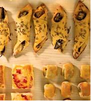 Сметану развести теплой водой, добавить соль, сахар, дрожжи, муку и замесить тесто. Дать ему взойти. Раскатать и нарезать квадратиками размером 5 см. На каждый квадрат положить по диагонали по 1 рыбке. Завернуть противоположные края и слегка прижать пальцами место соединения. Смазать тесто слегка взбитым яйцом, посыпать тмином, выпекать 15 мин. Для оливок раскатать тесто, уложить вдоль края оливки вплотную друг к другу, прикрыть краем теста, защипнуть, отрезать рулетик. Потом рулетик нарезать на отдельные кусочки так, чтобы в каждом оказалась оливка. Смазать яйцом, выпекать до золотистости.