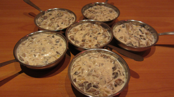 Режем мелко шампиньоны и начинаем их обжаривать на сковороде.Сначала вы париться весь сок,а потом слегка именно слегка обжарить шампиньоны,чтоб они были мягонькие .,добавляем соль и перец по вкусу.