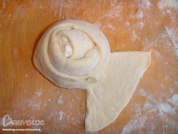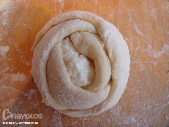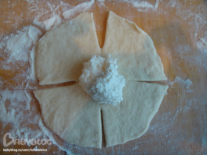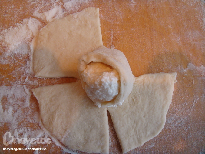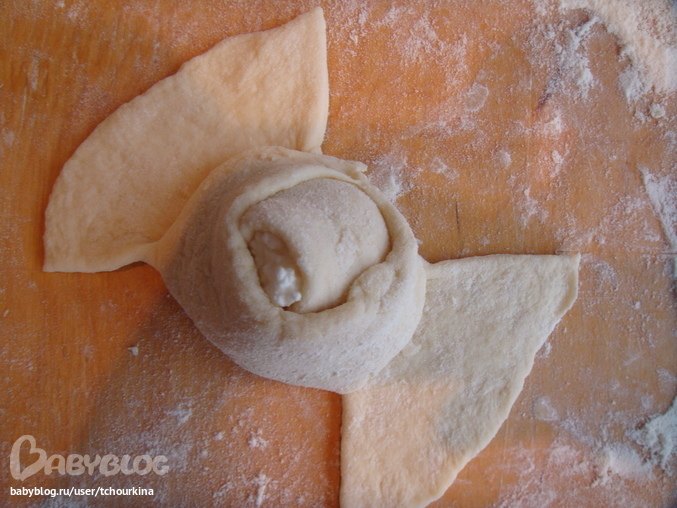 Раскатать каждый комочек в круг, пложить в середину 1 ст.л. начинки и сделать 4 надреза:
