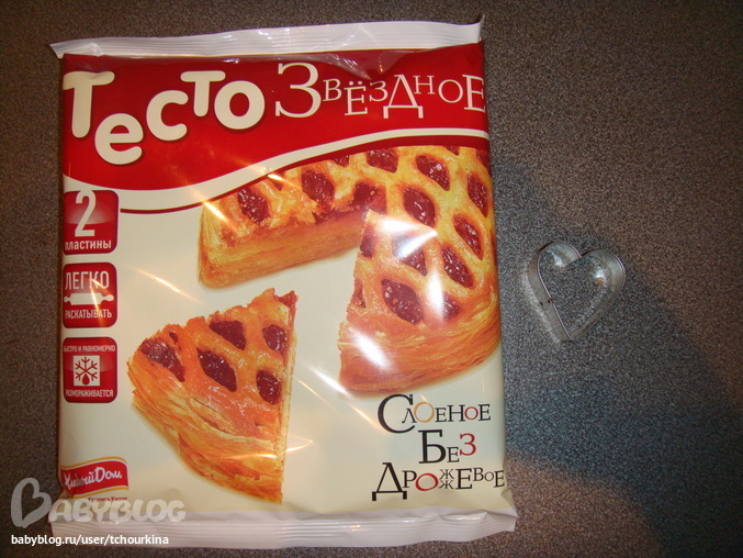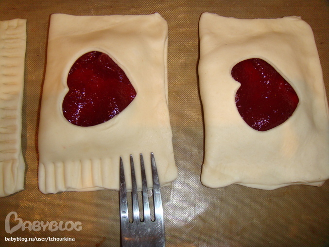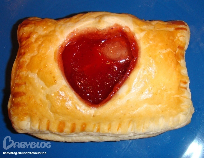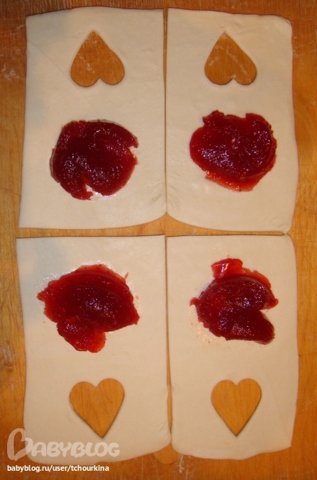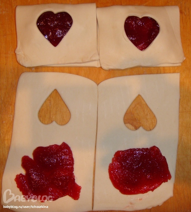 Понадобится 1 пачка слоеного бездрожжевого теста, выемка в виде сердечка и красное варенье: