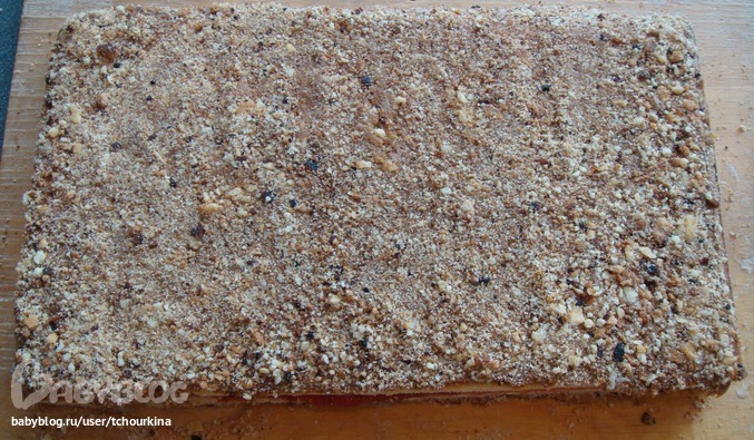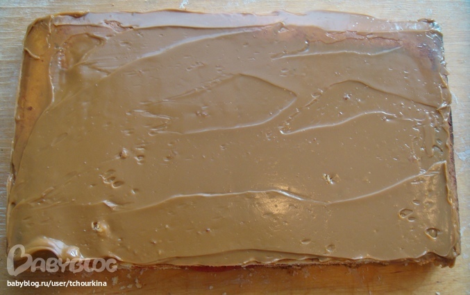 Верх можно покрыть помадкой, глазурью, шоколадом, карамелью. А я обмазала вареной сгущенкой: