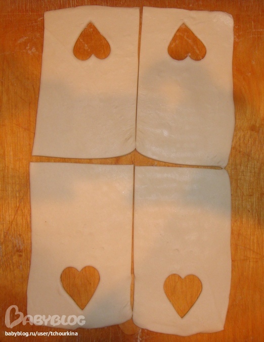 Квадратный пласт раскатываем в прямоугольник, режем на 4 равные части, выемкой у одного края делаем сердечки: