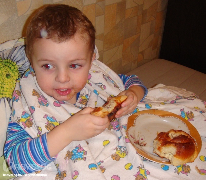 А сам Вовик любит любую выпечку и иногда не может выбрать, кусает из двух рук сразу: