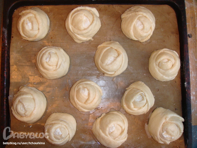 Раскладываем готовые розочки на противень и даем хорошенько подойти:
