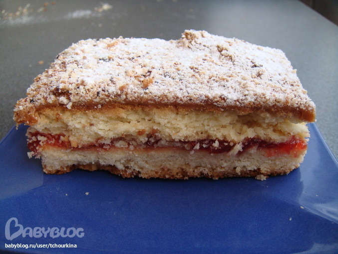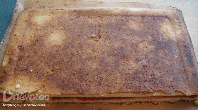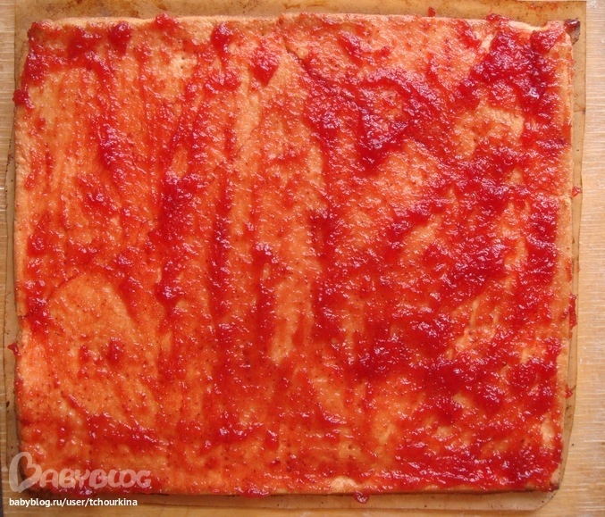 Горячий пласт покрыть густым яблочным повидло (а я захотела клубничным джемом):