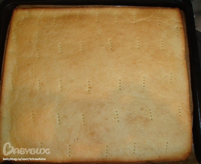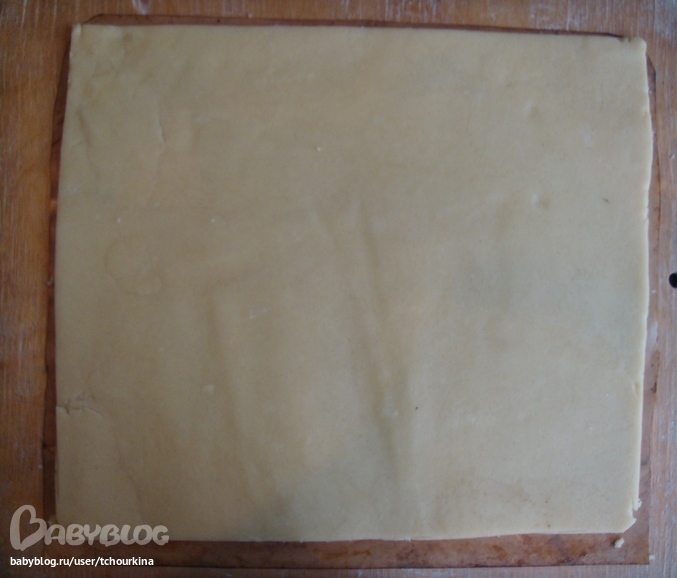 Раскатать тесто в пласт по размеру противня и переложить на застеленный противень: