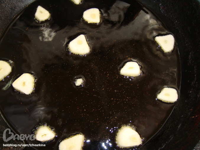 Высушить сухарики в духовке. На сковороду налить оливковое масло, после нагрева кинуть в него 2 зубка чеснока, порезанного на дольки: