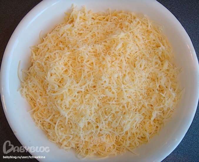 Отварить в кипящей подсоленной воде 5 минут и сразу опустить в холодную воду. Натереть в миску 300 г сыра: