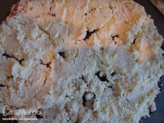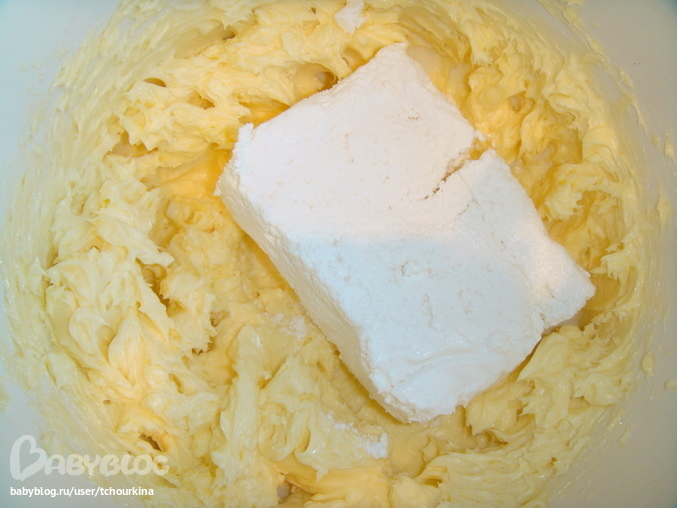 Для крема взбить 250 г сл.масла добела, постепенно вводя сгущеное молоко. Затем добавить пачку творога и взбить: