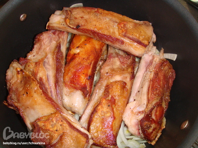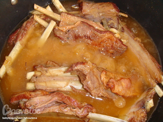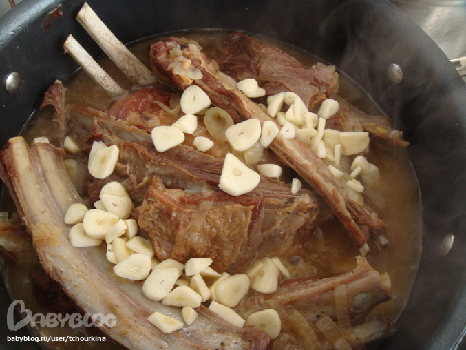 Добавить много лука, влить жир со сковороды и стакан воды. Закрыть крушкой и тушить час. Затем добавить соль, черный молотый перец, тархун, чабрец, лаврик, чеснок: