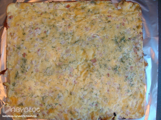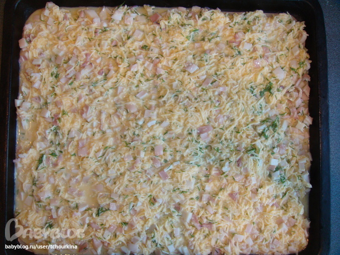 Взбить 6 яиц в половиной стакана молока. Высыпать туда сыр с кальмарами и укропом. Перелить на противень, застеленный промасленным пергаментом (силиконовым ковриком, фольгой):