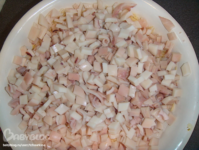 Порубить туда же укроп и нарезать кальмаров мелкими кубиками: