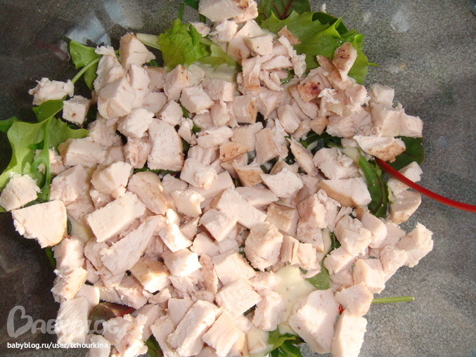 Второй слой - нарезанное кубиками белое куриное мясо и соус: