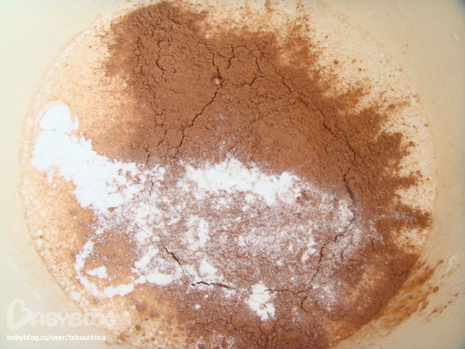 Взбить 1 яйцо со стаканом сахара. Добавить 100 мл молока, 50 мл растительного масла, 3 ст.л. какао, 1 ч.л. разрыхлителя, 1 ч.л. соды: