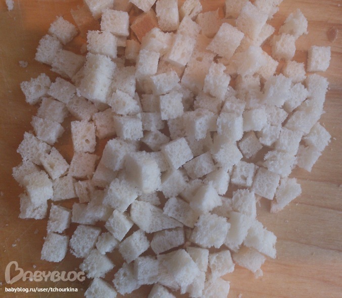 С батона срезать корки и нарезать кубики со сторонами полсантиметра:
