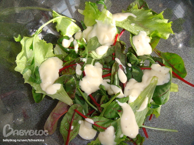 Собираем салат: миску натереть чесноком, уложить первый слой салатных листьев, накапать сверху соус: