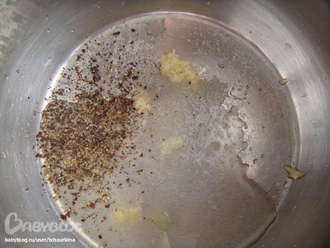 Для заправки смешать натертый зубок чеснока, свежемолотый черный перец, сахар, соль, лимонный сок, зеленое оливковое масло: