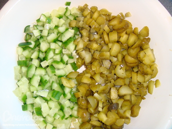 В это время нарезать мелкими кубиками свежие и консервированные огурцы, порубить туда же 3 яйца: