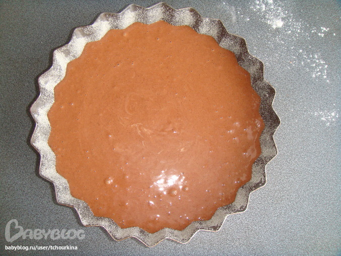 Всыпать 1,5 стакана муки и перемешать лопаткой. Влить 100 мл кипящей воды и тщательно перемешать. Вылить в смазанную форму: