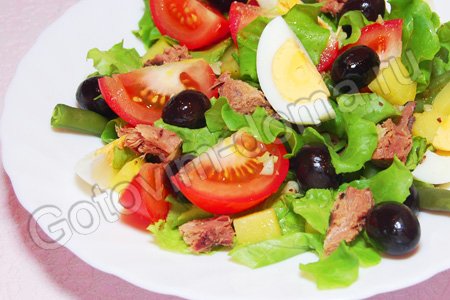 Охлажденной заправкой польем салат и украсим дольками яиц, тунцом и маслинами.
