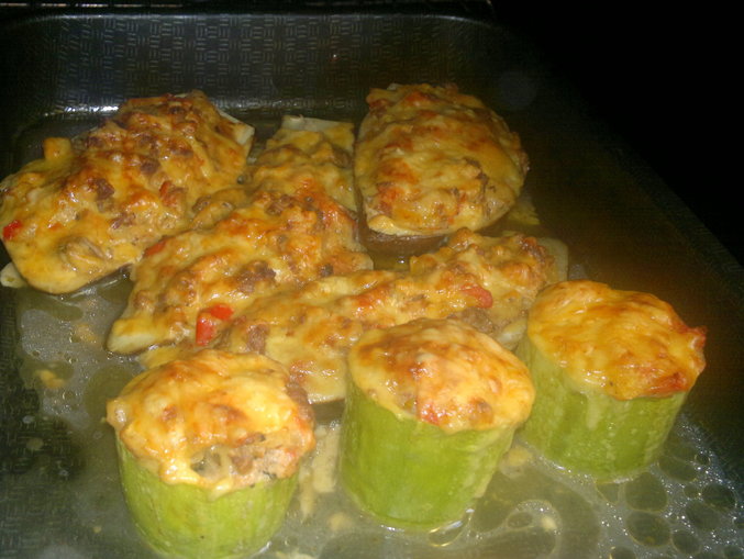Затем начинить лодочки баклажанов и стаканчики цуккини, аккуратно расставить их на противень, чтоб не упали. Посыпать тертым твердым сыром, на противень добавить немного водички, чтоб баклажаны хорошо пропеклись и в духовку на 30- 40 мин. Вот так у вас должно получиться в конце.