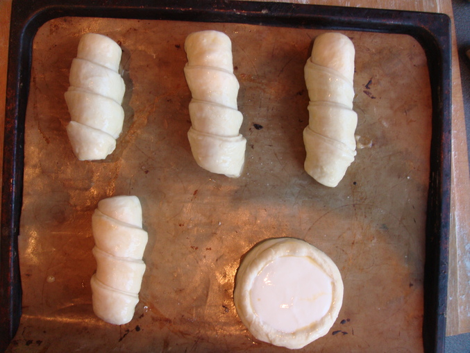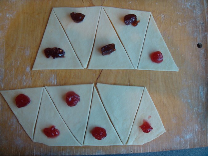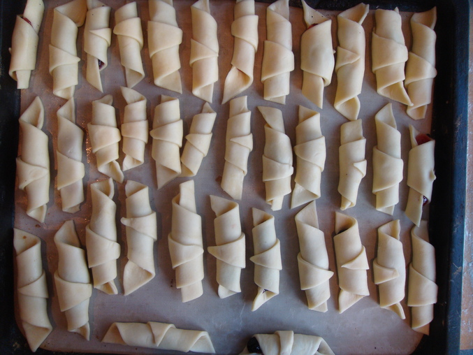 Еще (не знаю из какой кухни) делали рогалики (1 пачка растопленного маргарина+ 1 стакан сметаны и мука) с остатками разного варенья: