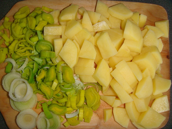 Через 40 минут варки бульон процедить, рыбу и кости удалить, добавить в бульон нарезанный картофель и лук порей: