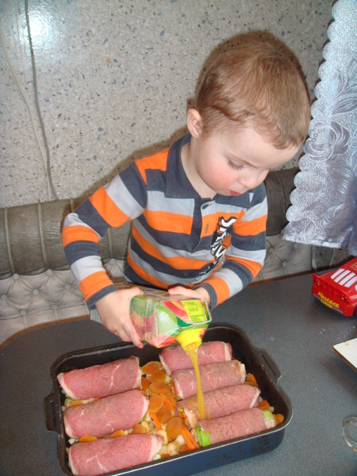 Туда же кладем оставшуюся курагу и морковку, заливаем соком с мякотью (яблочным, персиковым, абрикосовым, сливовым - по желанию):