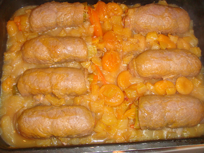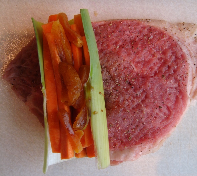 Собираем рулет: на пласт мяса кладем 1 трубочку порея, в него несколько брусков моркови, нарезанную курагу, поливаем соевым соусом. Затем закрываем второй половинкой лука порея, сворачиваем рулет: