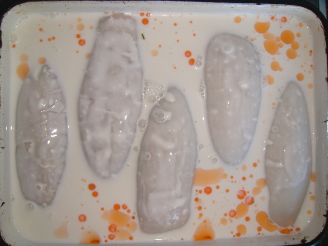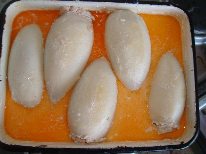 Перемешать, добавить черный перец и соль, набить тушки кальмаров, положить в форму для запекания: