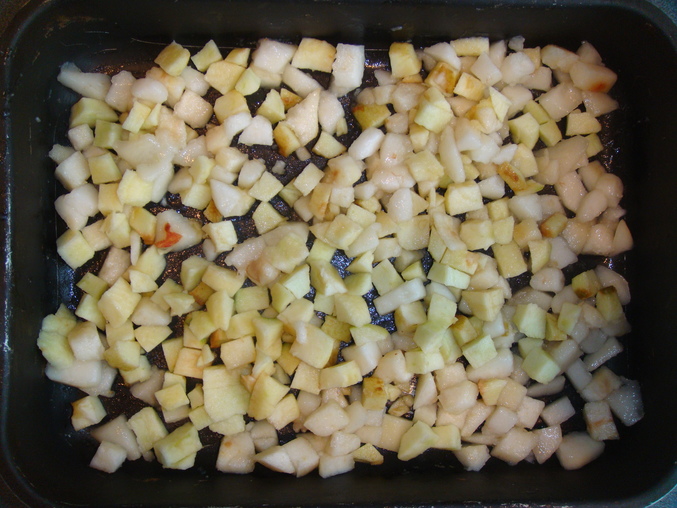 Закрыть дно формы для запекания кубиками яблок (я использовала грушу в этот раз):