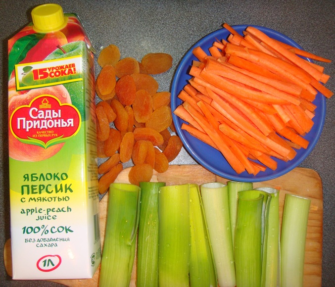 Подготовить овощи - нарезать соломкой сырую морковь, нарезать на трубочки лук порей, промыть курагу:
