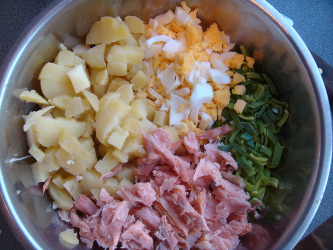 Добавить картофель кубиками, отварные яйца и копченую красную рыбу:
